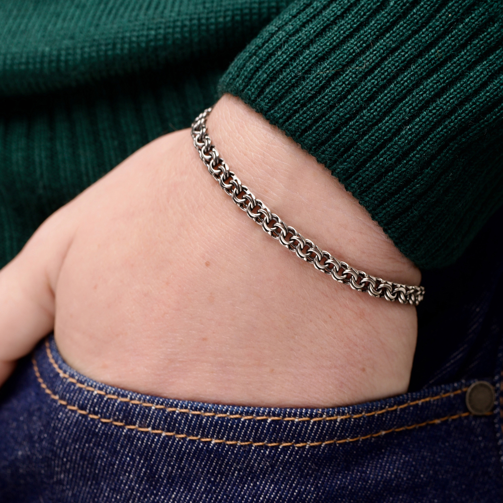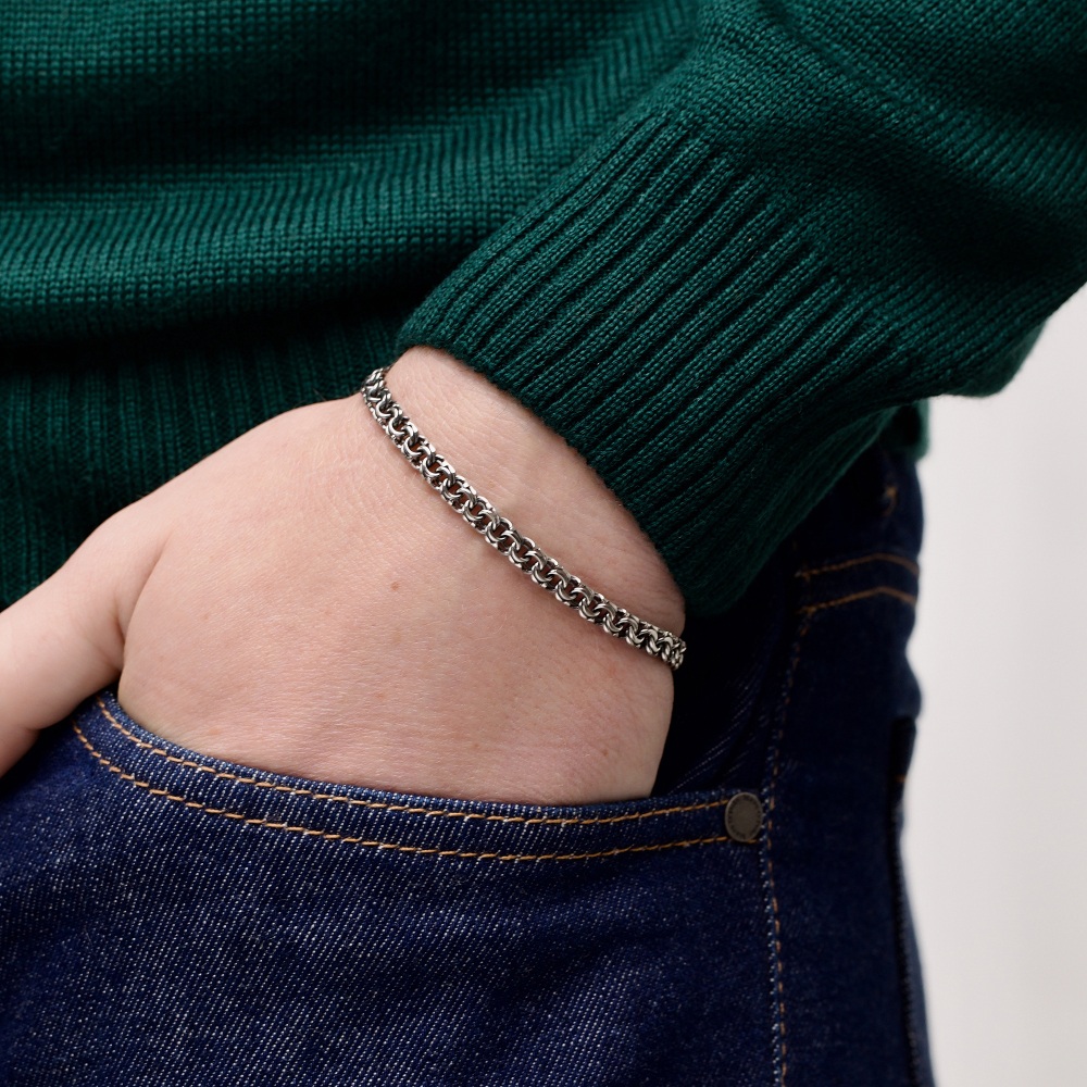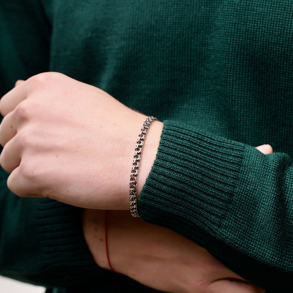 Якщо потрібно замовити стильний аксесуар, то Срібний браслет "Козацький Бісмарк" стане ідеальним вибором. Проба 925 підтверджує його якість. Метал срібло давно став символом благородства і достатку. Покриття чорніння дозволило зробити аксесуар більш унікальним. Виробник використовує вишукане і міцне плетіння козацький бісмарк. Для чоловіків прикраса підійде ідеально.