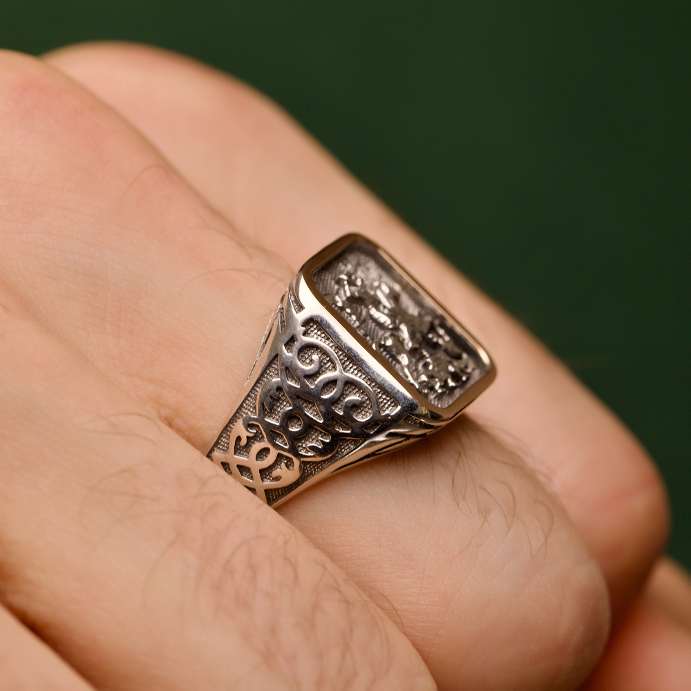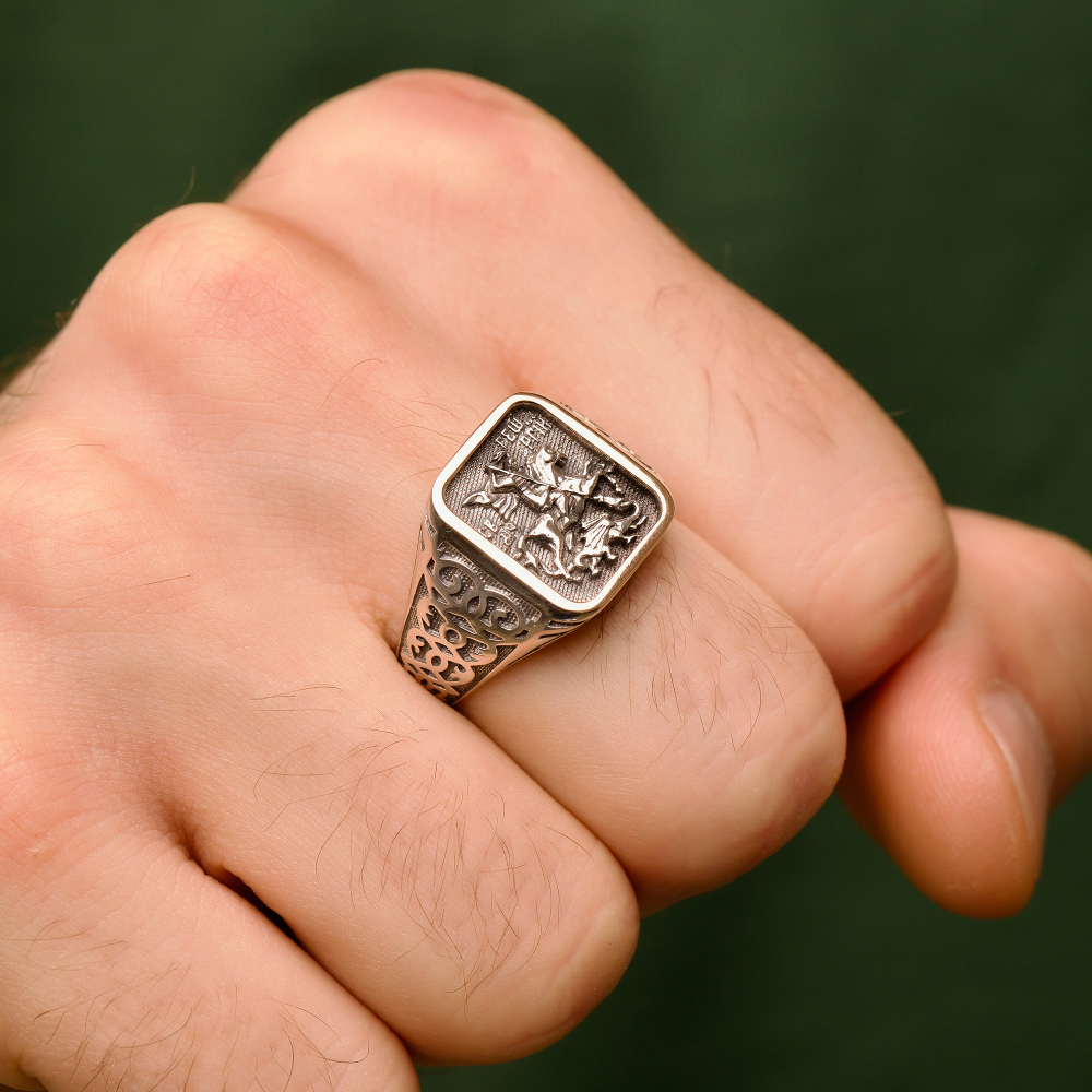 Купить Серебряное кольцо "Св. Георгий" недорого с доставкой можно уже сегодня, оставив заявку любым удобным способом. Покрытие чернение гарантирует длительную службу аксессуара. Серебряное кольцо "Св. Георгий" может быть изысканным и оригинальным подарком по случаю любого торжества.