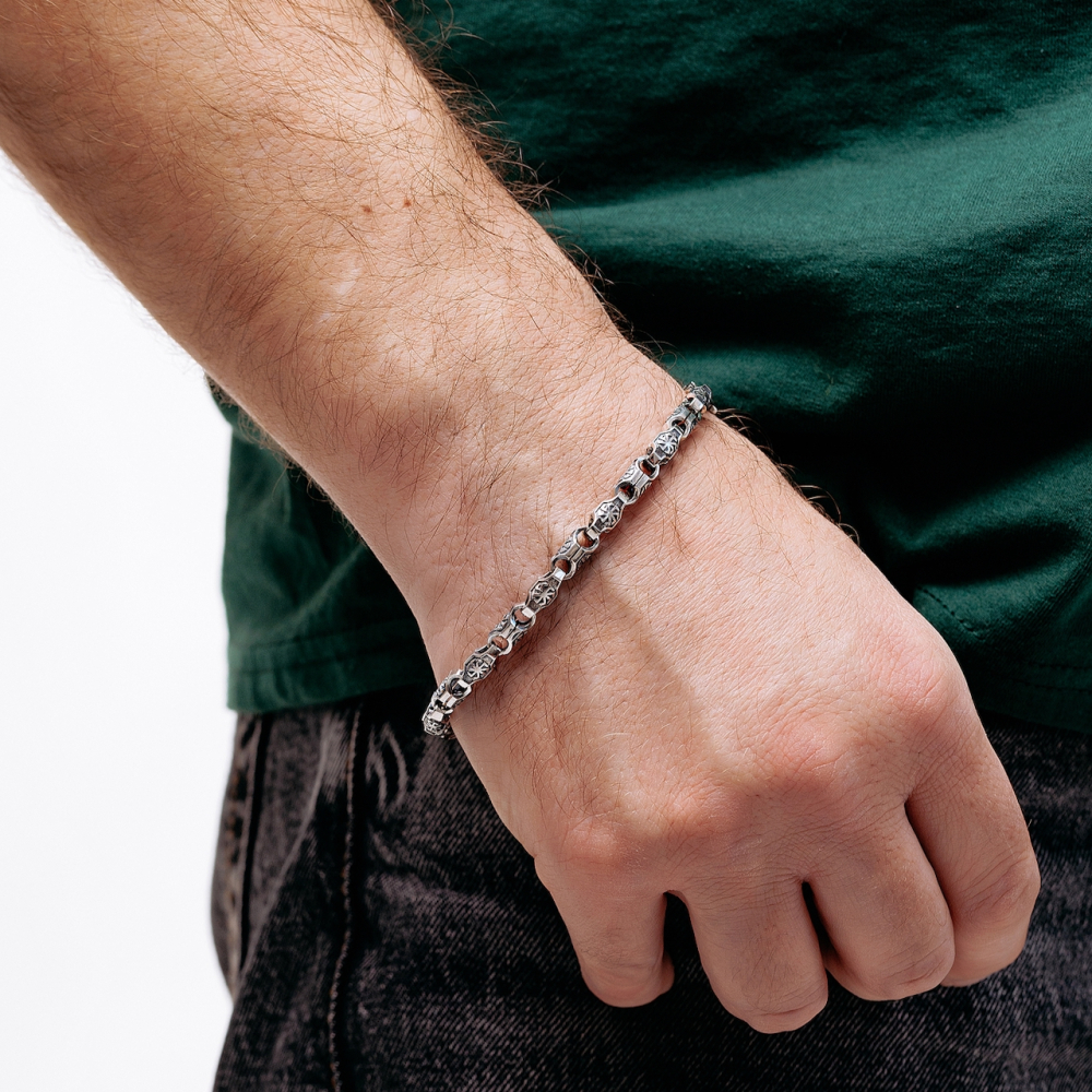 Если нужно заказать стильный аксессуар, то Серебряный браслет "Арктика" станет идеальным выбором. Проба 925 подтверждает его качество. Металл серебро давно стал символом благородства и достатка. Покрытие чернение позволило сделать аксессуар более уникальным. Производитель использует изысканное и прочное плетение . Для мужчин украшение подойдет идеально.