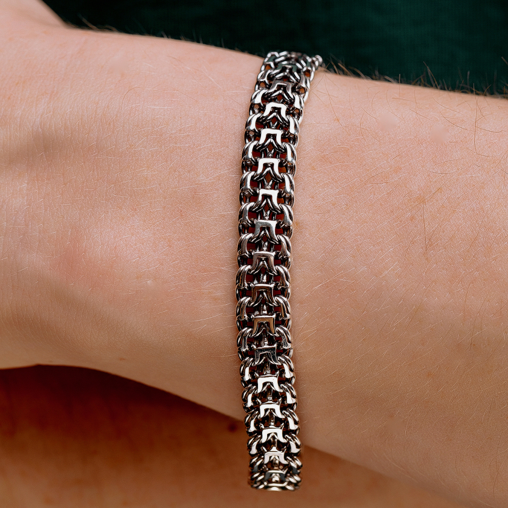 Если нужно заказать стильный аксессуар, то Серебряный браслет "Император" станет идеальным выбором. Проба 925 подтверждает его качество. Металл серебро давно стал символом благородства и достатка. Покрытие чернение позволило сделать аксессуар более уникальным. Производитель использует изысканное и прочное плетение фараон. Для мужчин украшение подойдет идеально.