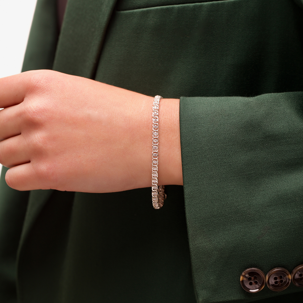 Если нужно заказать стильный аксессуар, то Серебряный браслет "Нежность" станет идеальным выбором. Проба 925 подтверждает его качество. Металл серебро давно стал символом благородства и достатка. Покрытие родирование позволило сделать аксессуар более уникальным. Производитель использует изысканное и прочное плетение арабский бисмарк . Для женщин украшение подойдет идеально.