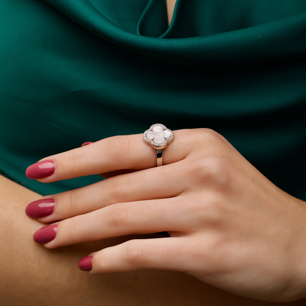 Купити Срібна каблучка "Cloveria" недорого з доставкою можна вже сьогодні, залишивши заявку будь-яким зручним способом. Покриття родіювання гарантує тривалу службу аксесуара. Срібна каблучка "Cloveria" може бути вишуканим і оригінальним подарунком з нагоди будь-якого торжества.