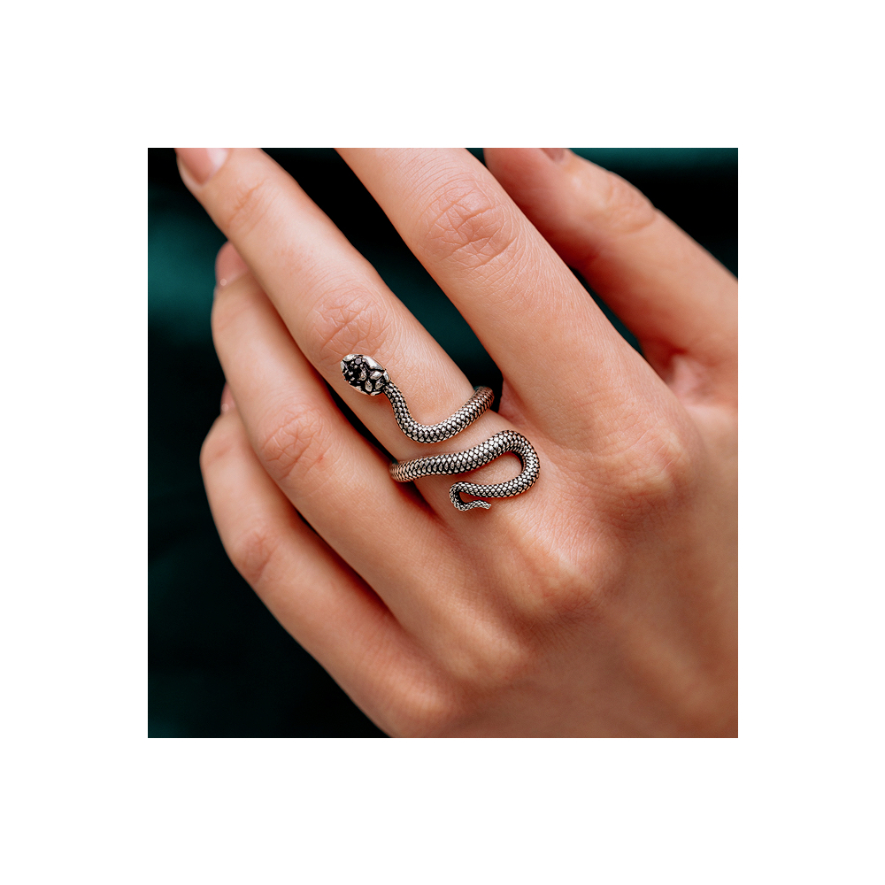 Купити Срібна каблучка "Змія" недорого з доставкою можна вже сьогодні, залишивши заявку будь-яким зручним способом. Покриття чорніння гарантує тривалу службу аксесуара. Срібна каблучка "Змія" може бути вишуканим і оригінальним подарунком з нагоди будь-якого торжества.