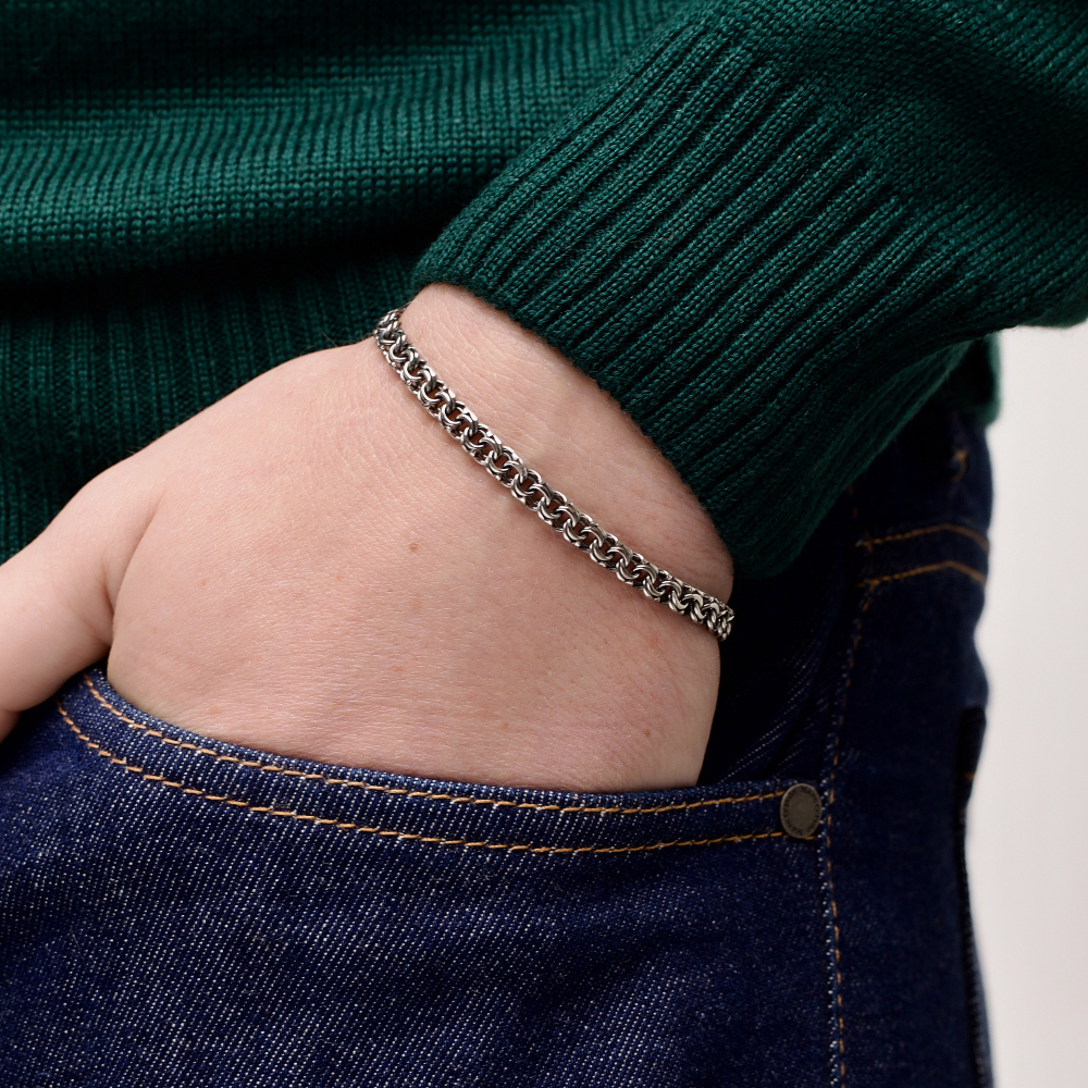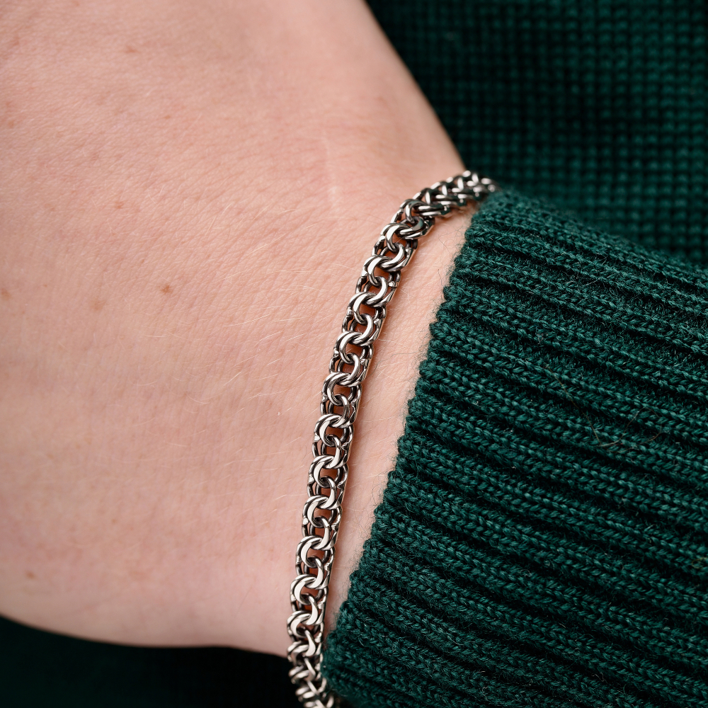 Якщо потрібно замовити стильний аксесуар, то Срібний браслет "Козацький Бісмарк" стане ідеальним вибором. Проба 925 підтверджує його якість. Метал срібло давно став символом благородства і достатку. Покриття чорніння дозволило зробити аксесуар більш унікальним. Виробник використовує вишукане і міцне плетіння козацький бісмарк. Для чоловіків прикраса підійде ідеально.