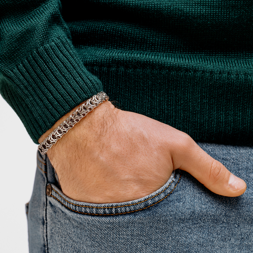 Якщо потрібно замовити стильний аксесуар, то Срібний браслет "Рамзес" стане ідеальним вибором. Проба 925 підтверджує його якість. Метал срібло давно став символом благородства і достатку. Покриття чорніння дозволило зробити аксесуар більш унікальним. Виробник використовує вишукане і міцне плетіння рамзес. Для чоловіків прикраса підійде ідеально.