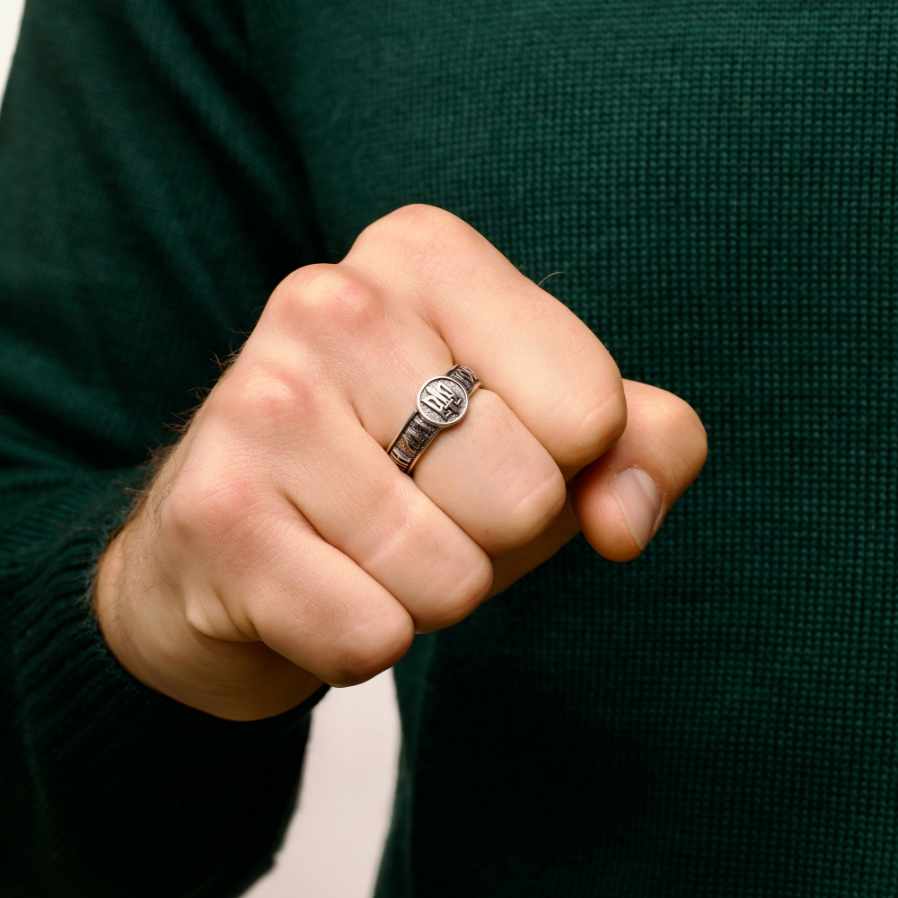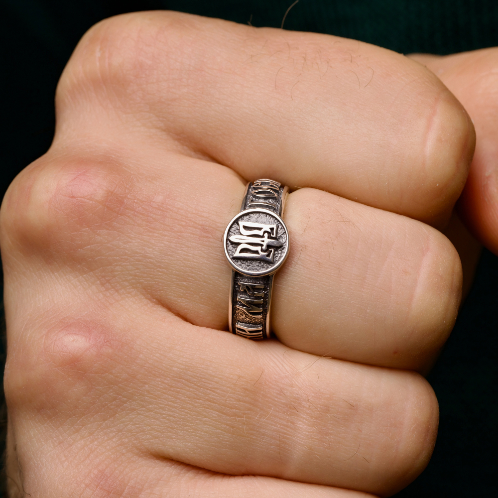 Купити Срібний перстень "Тризуб" недорого з доставкою можна вже сьогодні, залишивши заявку будь-яким зручним способом. Покриття чорніння гарантує тривалу службу аксесуара. Срібний перстень "Тризуб" може бути вишуканим і оригінальним подарунком з нагоди будь-якого торжества.